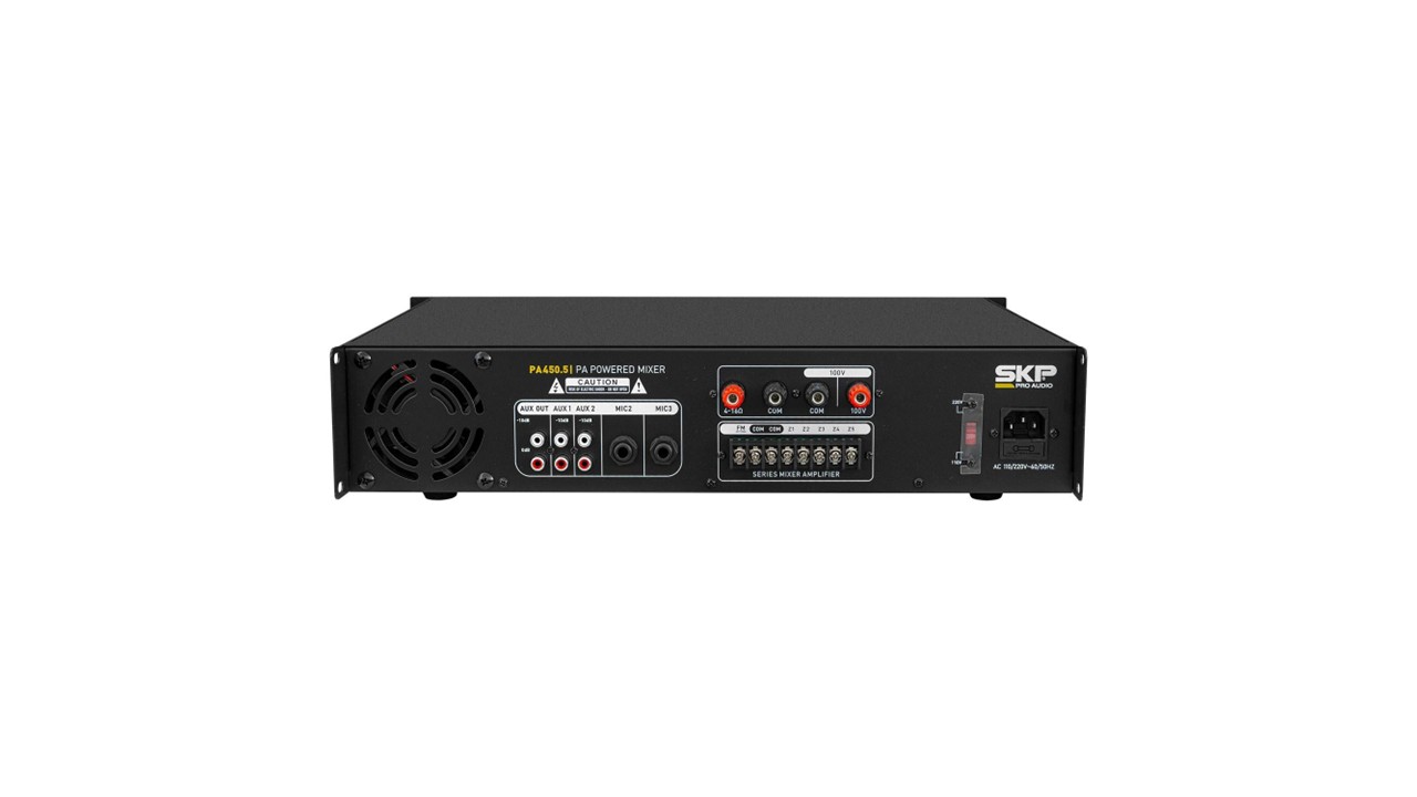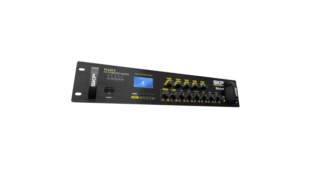 El PA 450.5 de SKP PRO AUDIO es un mezclador profesional multizona potenciado, diseñado para brindar una solución de sonido integral en entornos comerciales e institucionales. Su formato rankeable de 2U con panel frontal de aluminio lo convierte en una opción robusta y duradera para instalaciones fijas. Dispone de 6 canales de entrada totales, incluyendo Bluetooth®, radio FM, USB, además de 3 entradas de micrófono y 2 auxiliares, lo que permite conectar múltiples fuentes de audio de manera sencilla y eficiente.Este equipo incorpora un amplificador de potencia de 450W, con control de volumen independiente para 5 zonas, permitiendo una distribución precisa del sonido en distintos sectores de un mismo espacio. Gracias a esta funcionalidad, el PA 450.5 es ideal para su uso en escuelas, iglesias, edificios comerciales, estaciones, plazas y otros lugares públicos donde se requiere una gestión clara y segmentada del audio.