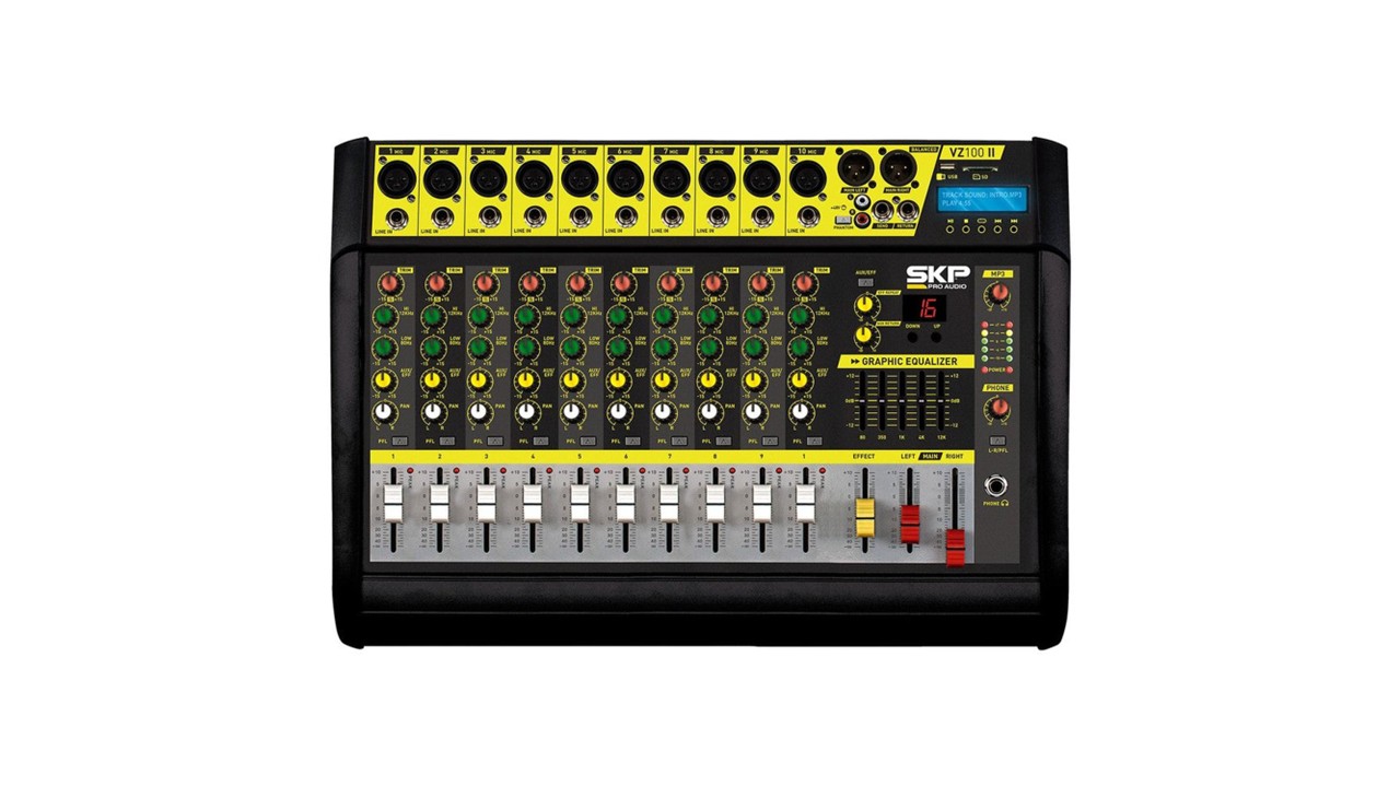 La SKP VZ-100 II es una consola potenciada de 10 canales que combina potencia, conectividad y control en un solo equipo. Con 250W RMS por canal a 4 ohmios, puedes conectar directamente parlantes pasivos sin necesidad de amplificador externo, ideal para eventos en vivo, presentaciones o salas de ensayo.