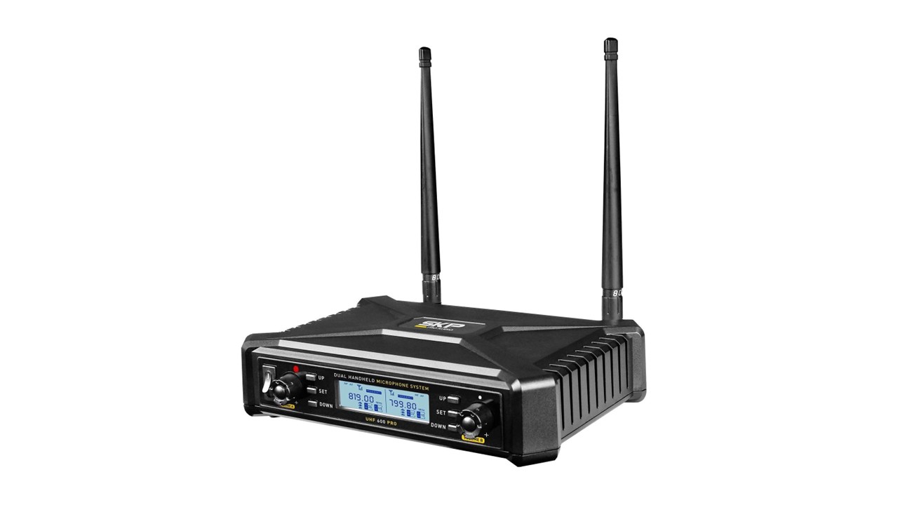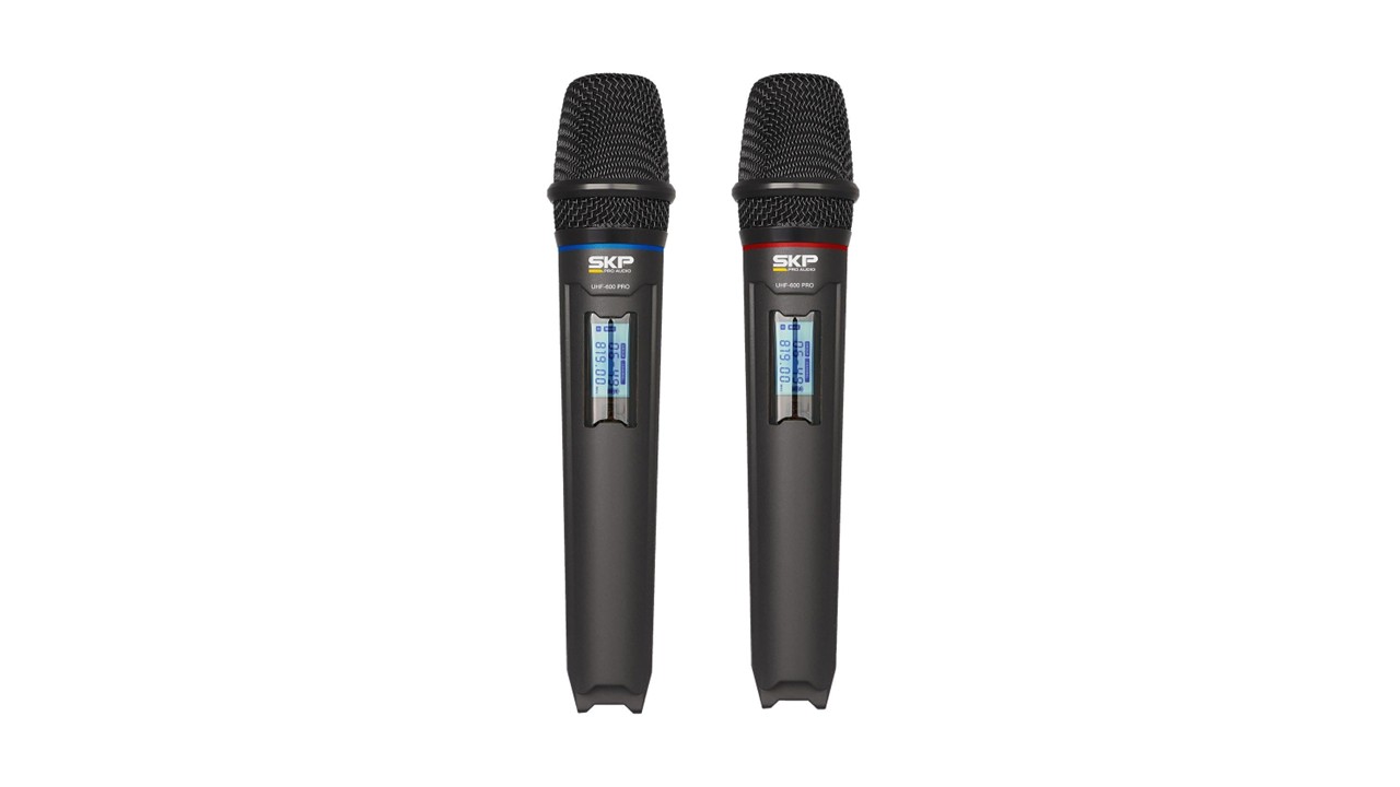El UHF 600 Pro de SKP es un set de micrófono inalámbrico doble que cuenta con dos micrófonos de mano, receptor con 300 canales (2x) seleccionable para evitar interferencia con otro dispositivo y doble antena lo que garantiza una excelente calidad de sonido y un gran alcance. Este modelo cuenta con un selector automático por infrarrojo para sincronizar la frecuencia del receptor con el micrófono. Su estructura es de plastico resistente y duradero para una larga vida de uso. El UHF 600 Pro está diseñado para múltiples usos tales como animadores, cantantes, eventos entre otros.